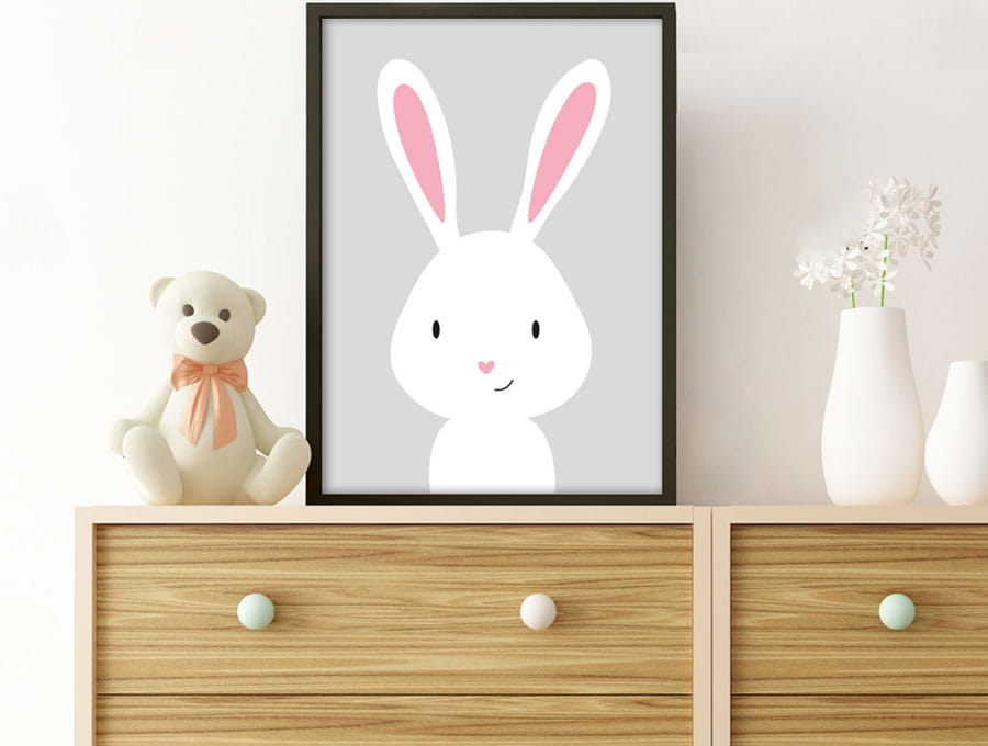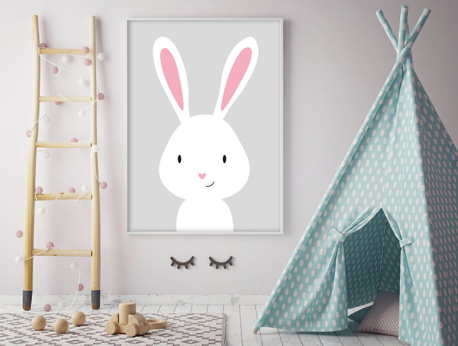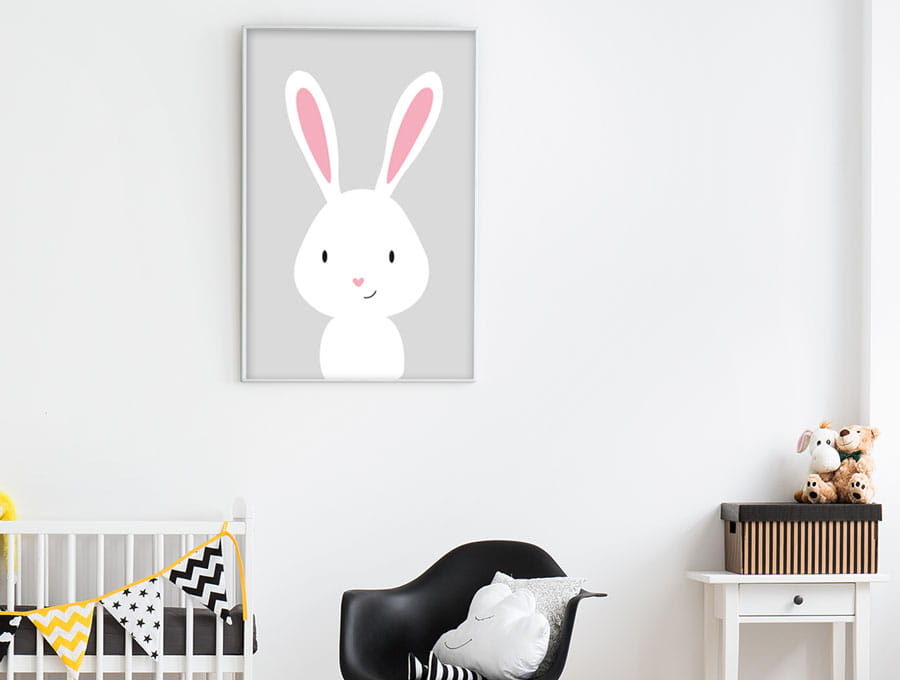 Bílý králíček na šedém podkladu bude nádherným a originálním doplňkem dětského pokoje. Tento plakát má zajímavý design, je nadčasový a je vytištěn na kvalitním saténovém papíře o hmotnosti 200g/m2.