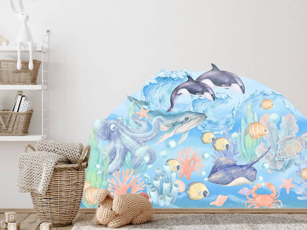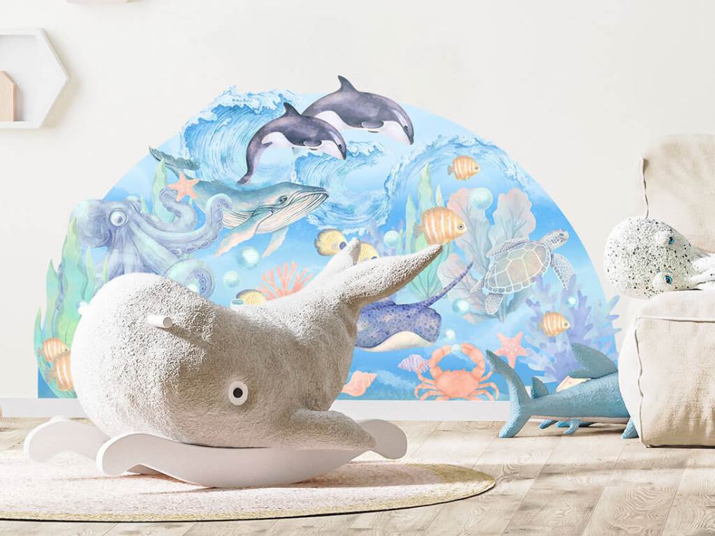 Krásná, dominantní samolepka na stěnu, v příjemných barvách, se živočichy z moře přemění každou místnost v neprobádaný podmořský svět. Nálepka ve velkém rozměru je nejen krásnou a nepřehlédnutelnou dekorací, ale zároveň chrání zeď před znečištěním nebo poškozením. Nálepka na zeď zahrnuje všechna oblíbené zvířátka, která děti znají z knížek – velrybu, chobotnici, rejnoka, želvu či kosatku. Nálepku lze umístit jak na stěnu, tak i na jakýkoliv hladký povrch. Nálepka na zeď je opatřena speciálním matným laminátem, který ji chrání před poškrábáním a také usnadňuje lepení – film je tlustší a snadněji se přenáší na stěnu.
