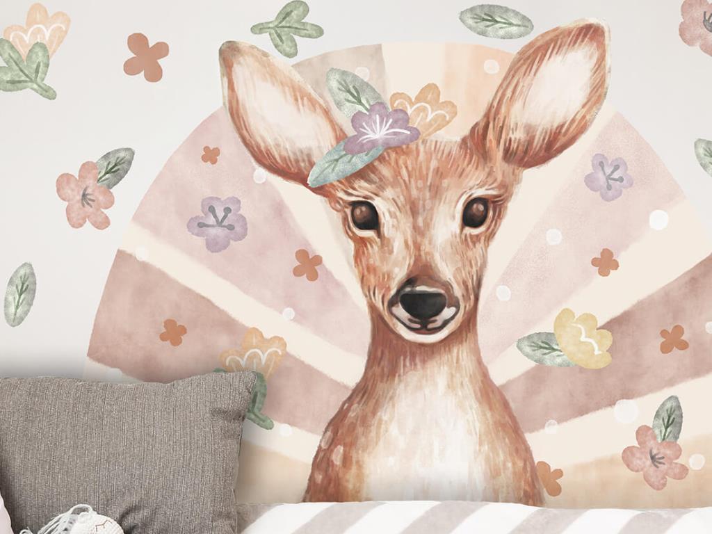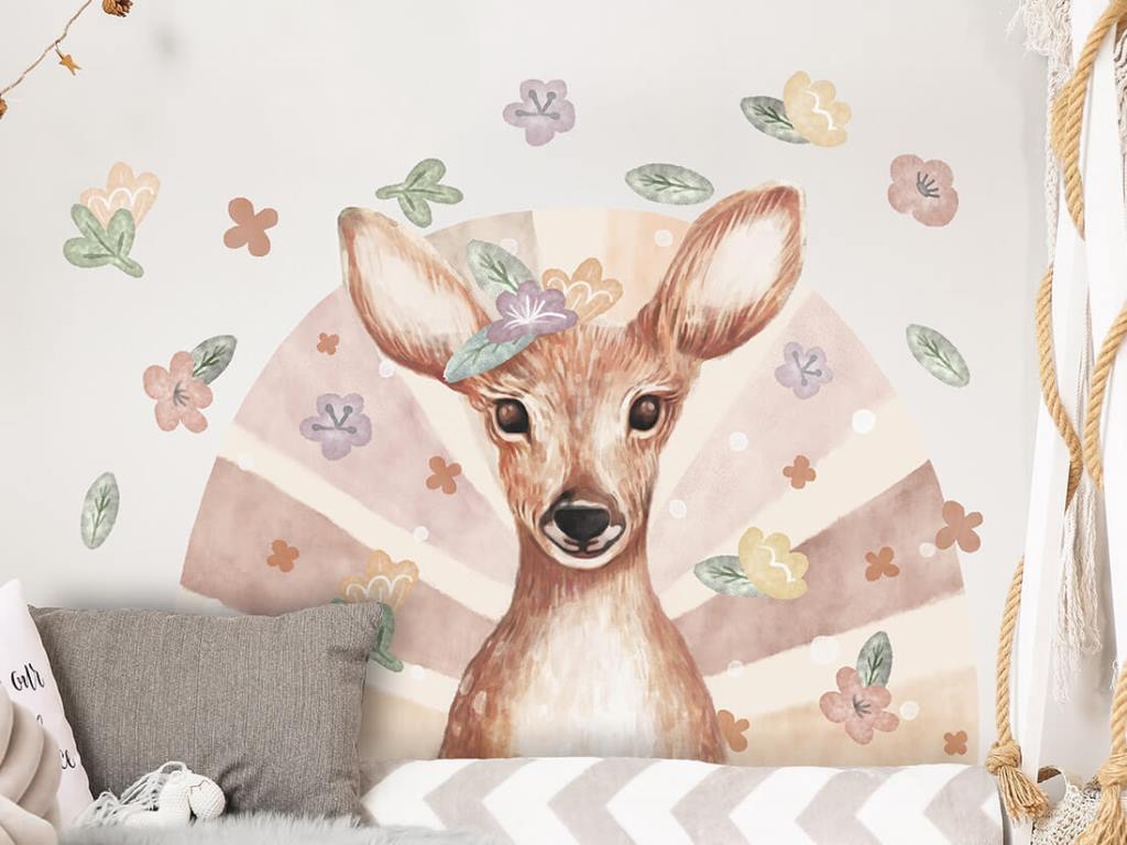 Samolepka na zeď srnky na barevném pozadí s řadou doplňkových prvků v podobě lístků a květů byla vytvořena pro všechny příznivce lesních zvířat a květinových motivů. Vkusná nálepka se bude skvěle vyjímat za dětskou postelí, postýlkou, psacím stojem nebo s ní vydekorujete hrací koutek. Nálepka ve velkém rozměru je nejen krásnou a nepřehlédnutelnou dekorací, ale zároveň chrání zeď před znečištěním nebo poškozením.