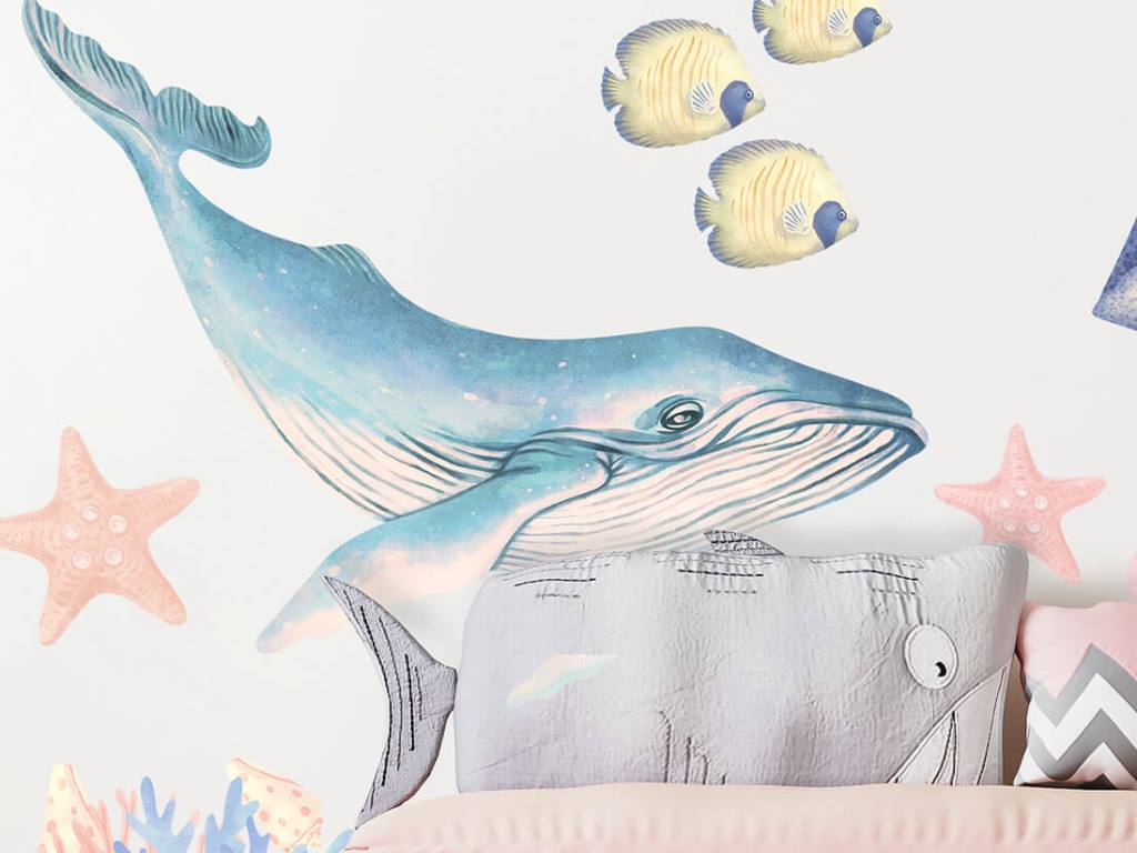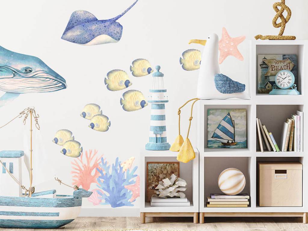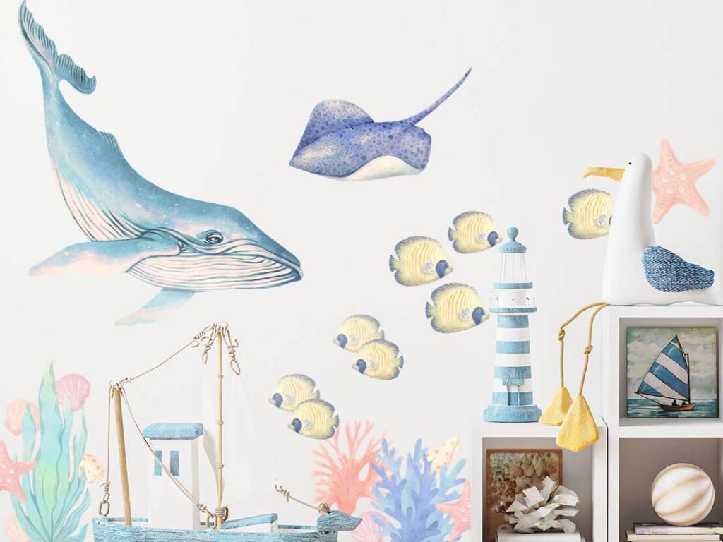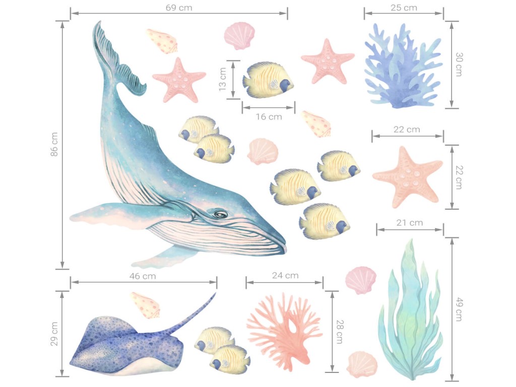 Nálepky na zeď Zvířátka z oceánů jsou originální dekorací do námořnického pokoje. Samolepky potěší všechny milovníky života pulzujícího pod vodní hladinou. Sada obsahuje velrybu, rejnoka, rybu, hvězdici, mušle, korály a mořské řasy. Nálepky lze umístit jak na stěnu, tak i na jakýkoliv hladký povrch. Nálepka na zeď je opatřena speciálním matným laminátem, který ji chrání před poškrábáním při každodenním používání, a také usnadňuje lepení – film je tlustší a snadněji se přenáší na stěnu.