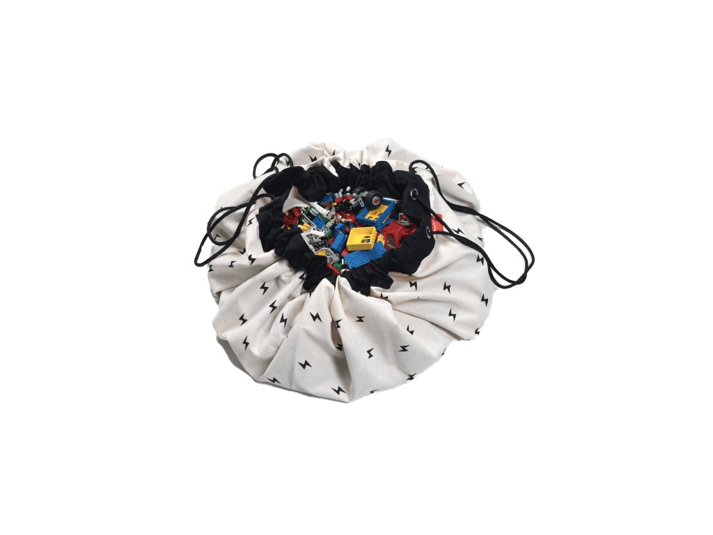 Úložný vak na hračky má oboustranný potisk. Jedna strana vaku je bílá s malými černými blesky a na druhé straně je vyobrazena silnice, budovy, parkoviště a další motivy. Naznačené silnice mohou děti brázdit každý den a s pomocí dalších stavebnic, dřevěných kostek si postaví celé město u sebe v pokoji. Designová hrací podložka podpoří dětskou fantazii a vezme děti do světa her. Zároveň si budou hrát pěkně v teploučku a nebude jim chladno od podlahy. A když je hraní přestane bavit, pouze zatáhnout za provázek a budou mít rázem uklizeno. Takový způsob uklízení děti jistě ocení.