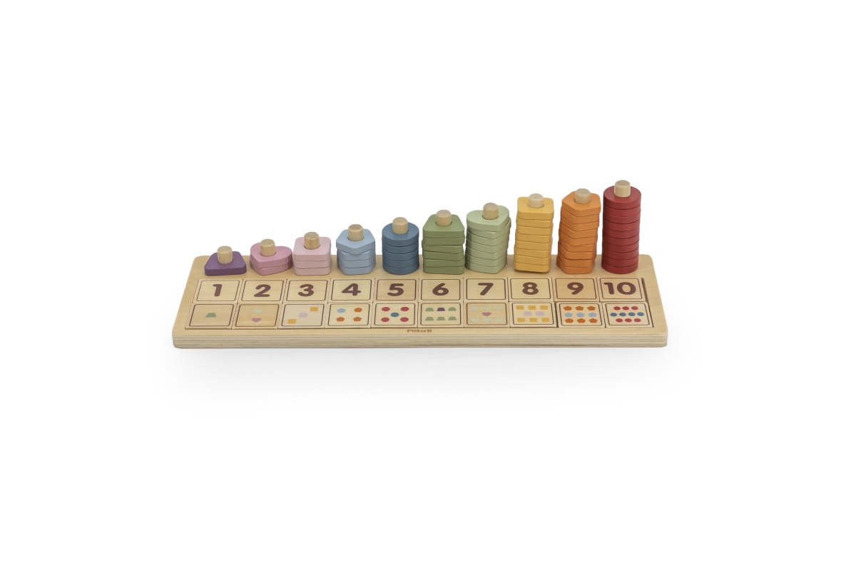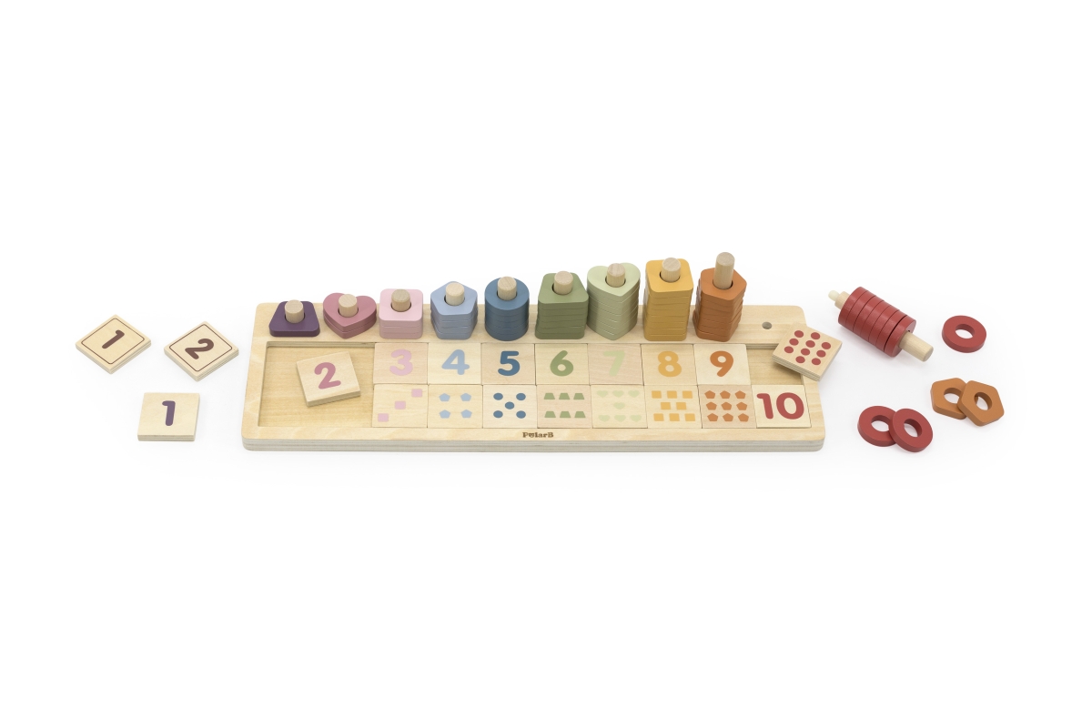 Dokud budou děti ještě malé, mohou tvary na desku nasazovat intuitivně a procvičovat jemnou motoriku, koordinaci rukou a očí i trpělivost. Jakmile trochu povyrostou, můžete pomaličku začít s přípravou na školu. Hra obsahuje desku, stojánky určené k navlékání určitého počtu různých tvarů, kostičky s čislicemi a obrázkové kostičky.