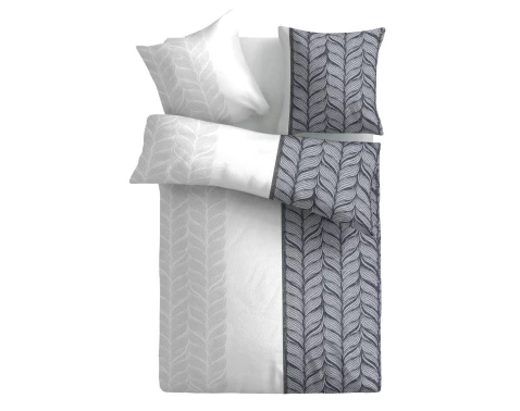 Moderní ložní povlečení z bavlněného saténu v bílé, šedé a modré barvě s motivem listů. Měkké, hebké a pohodlné pro kvalitní spánek a odpočinek.