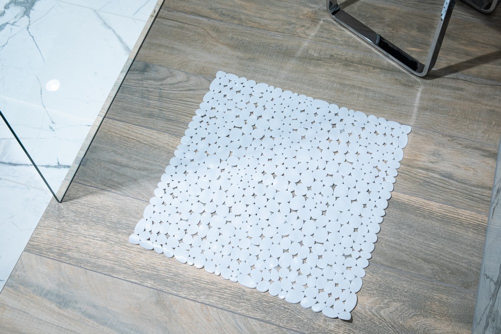 Čtvercová, bílá koupelnová předložka s motivem oblázků. Má protiskluzové přísavky pro zajištění bezpečnosti v koupelně. Čtvercová koupelnová předložka se doporučuje pro sprchové vaničky. Čistit na 30 stupňů, nežehlit, chemicky nečistit, nebělit, nesušit v sušičce.