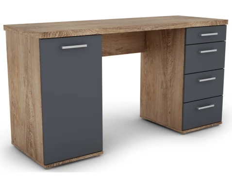 Prostorný psací stůl s pevnou konstrukcí má úložný prostor za levými dveřmi a řadu zásuvek. Vyroben v dekoru dub burgund a grafitově šedé barvě.