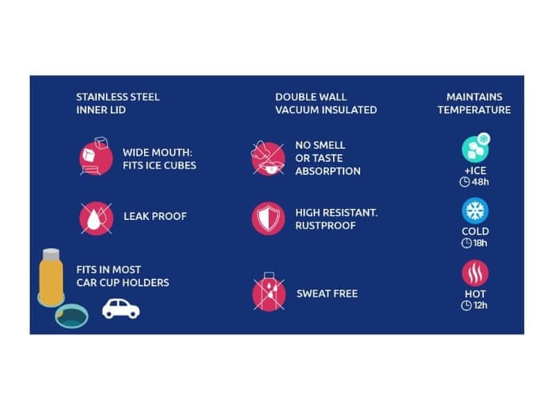Široké hrdlo nerezové termosky bez BPA umožňuje snadné vložení kostek ledu. Termoska udrží teplotu studeného nápoje s ledem až 48 hodin, studeného nápoje až 18 hodin a teplého nápoje až 12 hodin. Nerezová ocel nezanechává zápach a neabsorbuje chutě. Navíc se pyšní velmi vysokou odolností proti korozi.