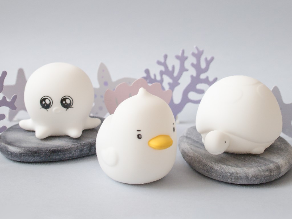 Mini lampičky do vody v podobě oblíbených vodních zvířátek – kačenky, chobotnice a želvičky, vyrobené z měkkého, bezpečného, certifikovaného a zdravotně nezávadného silikonu, jsou skvělou hračkou při koupání i pro nejmenší děti, ale i malým světýlkem do ruky, například při nočních návštěvách toalety, na cesty nebo jako vkusná dekorace na poličku. Vodotěsnost IP 67 umožňuje ponoření svítidel do vody až do hloubky 1 metru, ale ne déle než půl hodiny, pokud je spodní kryt správně uzavřen.