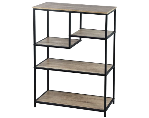 Moderní regál o šířce 75 cm má černou kovovou konstrukci a police v dekoru dub sonoma, které jsou zajímavě umístěny v různých výškových úrovních.