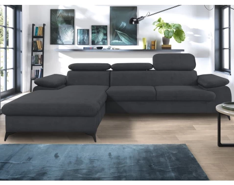 Rohová sedačka Scala s nastavitelnými opěrkami, prostorným otomanem a úložným prostorem. Látka antracitová tmavě šedá, černé kovové nohy, rozklad na lůžko.