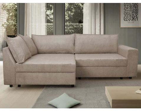 Rohová sedačka s prostorným otomanem může tvořit pravý nebo levý roh a pasuje i do malého prostoru obýváku. Očalouněna měkkoučkou strukturovanou látkou.