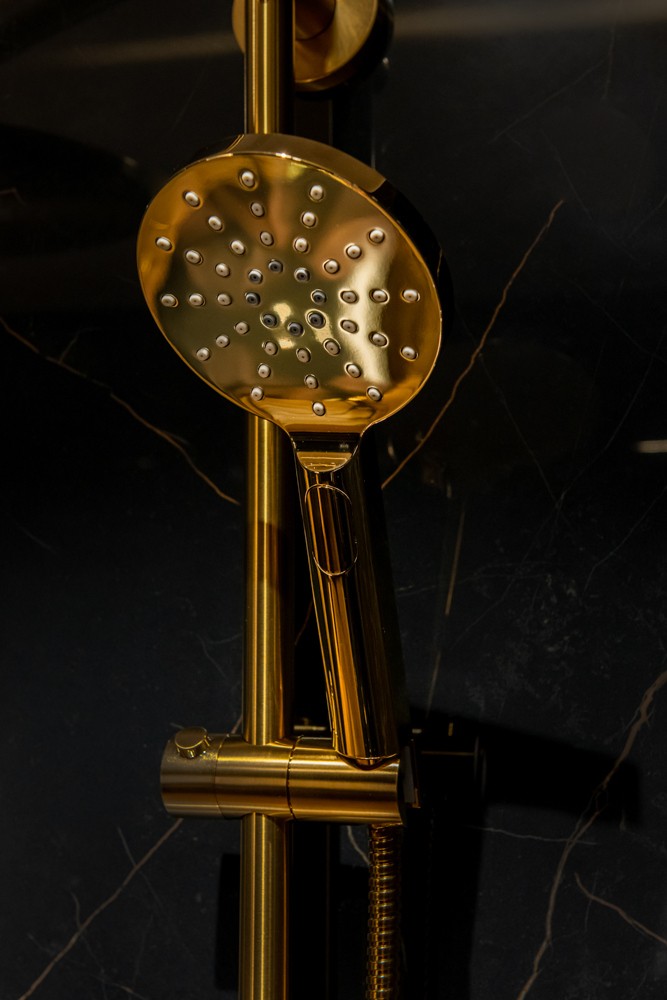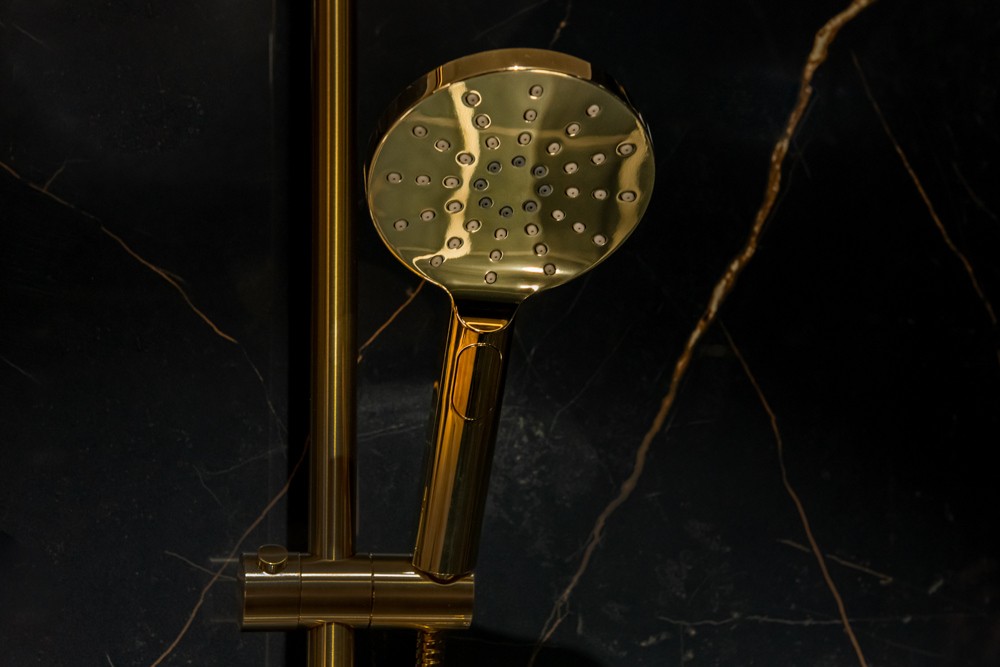 Zlatá sprchová hlavice je vybavena třemi různými proudy vody: sprej, mlha a sprej + mlha. Funkce lze kdykoli pohodlně měnit pomocí praktického tlačítka zabudovaného v rukojeti sluchátka. Sprchová hlavice je vyrobena z vysoce kvalitního ABS materiálu, který je odolný proti vlhkosti, odolný, lehký a snadno se čistí.