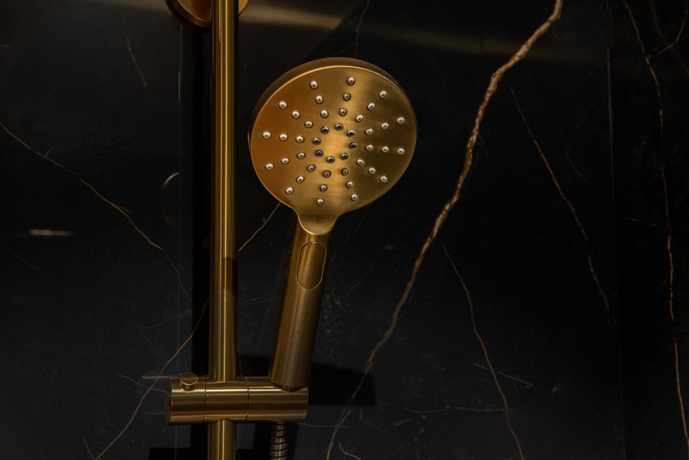 Sprchová hlavice zlaté barvy s matným povrchem. Je vybavena třemi různými vodními proudy: sprej, mlha a sprej + mlha. Funkce lze kdykoli pohodlně měnit pomocí praktického tlačítka zabudovaného v rukojeti sluchátka. Sprchová hlavice je vyrobena z vysoce kvalitního ABS materiálu, který je odolný proti vlhkosti, odolný, lehký a snadno se čistí.