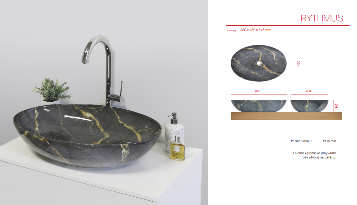 Popis otvor pro sifon: Ø 45 mm umyvadlo na desku mramorová struktura bez přepadu šířka 66 cm výška 14,5 cm hloubka 43 cm odchylka od uvedeného rozměru max. : 0,5 % Exclusivní kolekce italských keramických…