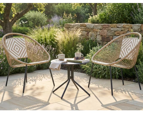 Malý 3dílný zahradní set z kovu a imitace béžového ratanu spojuje elegantní vzhled s praktickým využitím. Díky přirozenému odstínu béžové působí lehce a vzdušně a snadno zapadne do každého exteriéru.