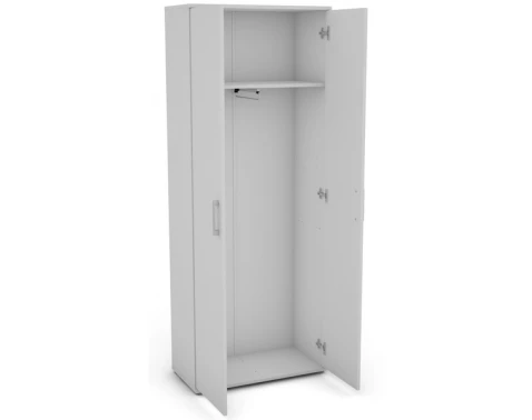 Šatní skříň s kovovou výsuvnou tyčí pro zavěšení ošacení a vnitřní policí, v bílé barvě.