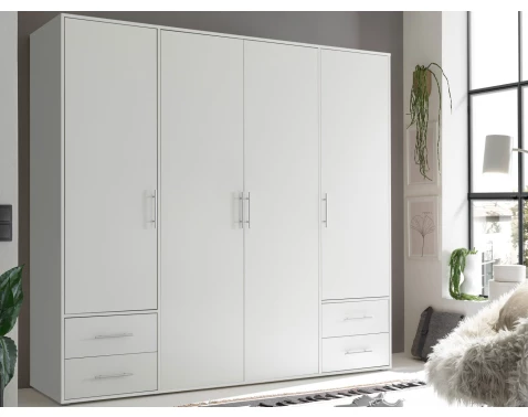 Klasická šatní skříň o šířce 206 cm v provedení bílá. Praktické větší úchyty dobře padnou do ruky při otevírání 4 otočných dveří nebo 4 zásuvek.