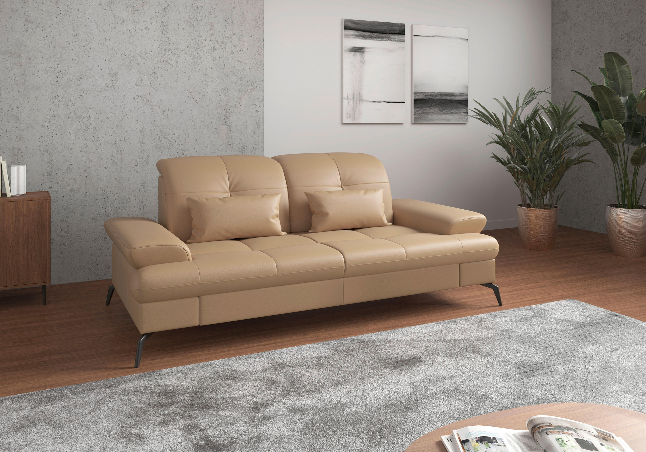 Tato třímístná pohovka se již brzy může stát centrem pohodlí, rodinného a společenského života i ve vašem obýváku. To nejdůležitější přehledně: Š x V x H: cca 212 x 90 x 122 cm počet míst k sezení: cca 3 sedací plocha: cca 150 x 75/60 cm (Š x H), výška sedáku: cca 47 cm max. nosnost: cca 240 kg max. nosnost každého sedáku: cca 80 kg područky: cca 31 x 56/68 cm (Š x V) výška nohy: cca 15 cm Proč ještě si ji pořídit Potah je vyrobený z kombinace pravé kůže a kvalitní syntetiky, která spojuje luxusní vzhled a příjemný dotek přírodního materiálu s lepším poměrem cena – výkon. Ideální oporu vám při odpočinku zajistí její pohodlné pěnové čalounění. Nezapomněli jsme ani na doplňkové funkce: hloubku sedáku, područku a opěrku hlavy si můžete individuálně nastavit. Pro váš stylový interiér Odstín barvy barvy cappuccina působí stylově a harmonicky zároveň. Celkový vizuální dojem čalouněného nábytku dotváří jeho umístění na úhlové noze z matné oceli v černé barvě. Cena zahrnuje: nastavení područky (odklápěcí) nastavitelná opěrka hlavy nastavení hloubky sedáku Pořiďte si design a komfort bez kompromisů s touto pohodlnou třímístnou pohovkou SIT & MORE v barvách barvy cappuccina a objednejte si ji výhodně online ještě dnes! Pravá kůže je přírodní produkt, a proto se skutečný vzhled může mírně lišit od produktového obrázku. – TYP:3200, – PUNCH CAPPUCCINO RSP,