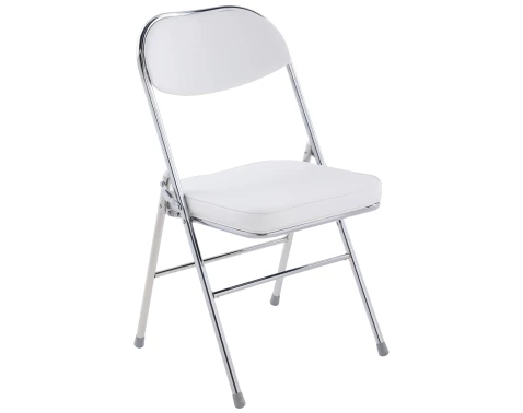 Praktická kovová židle má skládací konstrukci a univerzální využití v jakékoliv místnosti. Snadno ji můžete i přenášet. Sedací a opěrná část potažena bílou ekokůží.