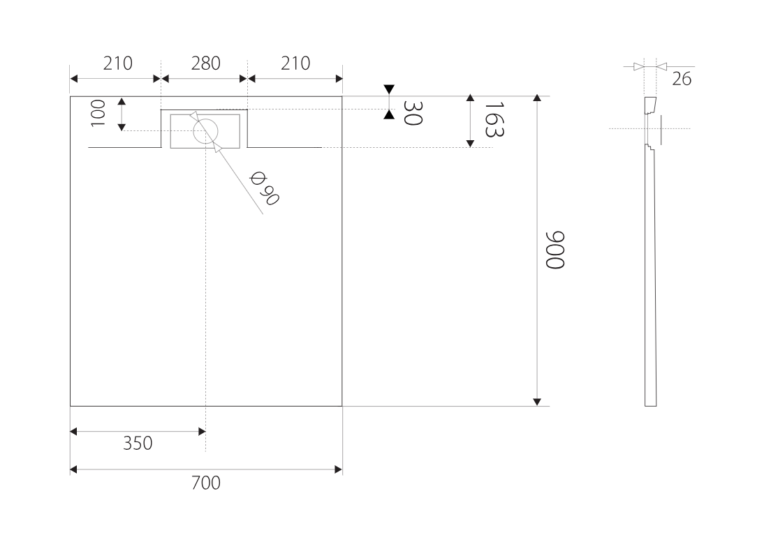 Sprchová vanička z tvrzeného polymeru obdélníková rozměr 90x70cm