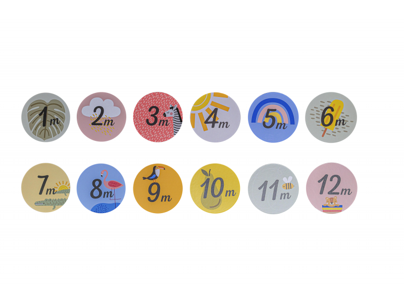 6 oboustranných kartiček s označením věku 1m – 12m vám umožní vytvoření série fotografií s označením věku v měsících po dobu prvního roku života vašeho dítěte.