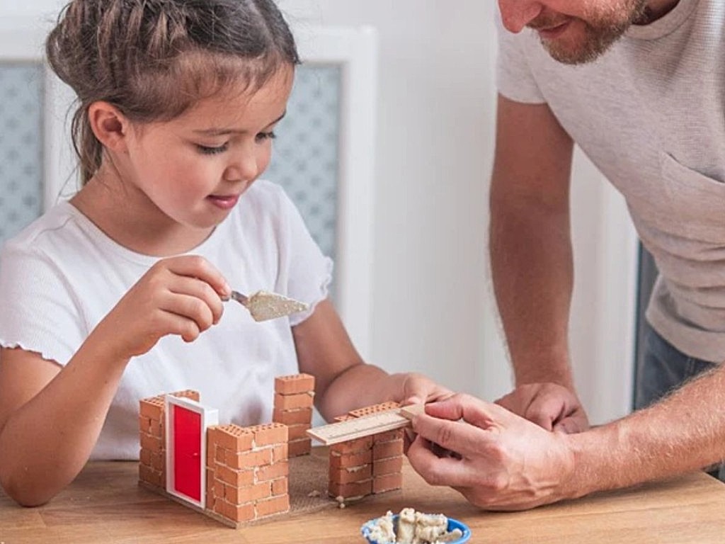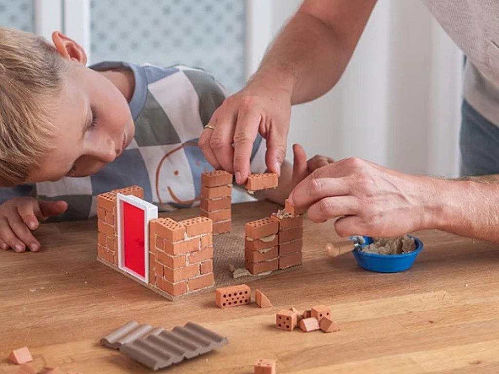 Dětská stavebnice s cihlami nabízí jedinečnou možnost postavit si dům, opravdovou stavbu, jen ve zmenšené podobě. Miniaturní hladítko a miska malty poskytují skutečný pocit ze stavby. Cihly z pravé hlíny se stejně jako originál vypalují ve vypalovací komoře do 1000 °C. Součástí je samozřejmě i základní deska. Ilustrovaný návod provede děti krok za krokem celým procesem stavby. Malta je vyrobena z přírodní směsi písku a kukuřičného extraktu. Je zdravotně nezávadná, rozpustná ve vodě a snadno omyvatelná z oblečení i nábytku. Na přípravu malty smícháte poměr vody a sypké směsi cca 1:2. Po dokončení stavby můžete ponořením domu do vody maltu rozpustit. Rychlost rozpuštění závisí na teplotě vody. Cihly lze neomezeně používat znovu pro další novostavby, kdy pouze pořídíte novou maltu pro další stavění.