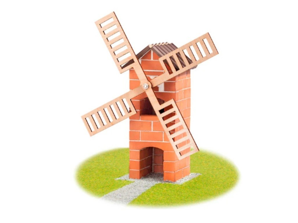 Kreativní sada obsahuje skutečné cihličky z pravé hlíny, speciální maltu, nářadí i návod – vše, co malý stavitel potřebuje ke stavbě vlastního větrného mlýna, který pod rukama doslova ožívá cihlu po cihle.