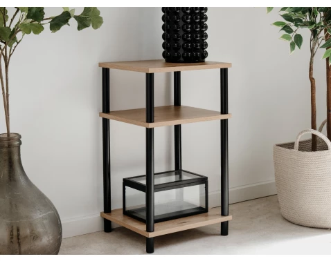 Úzký regál v dekoru dub artisan má šířku 34 cm a lze ho univerzálně využít i jako odkládací stolek. Černá kovová konstrukce zajišťuje stabilitu.