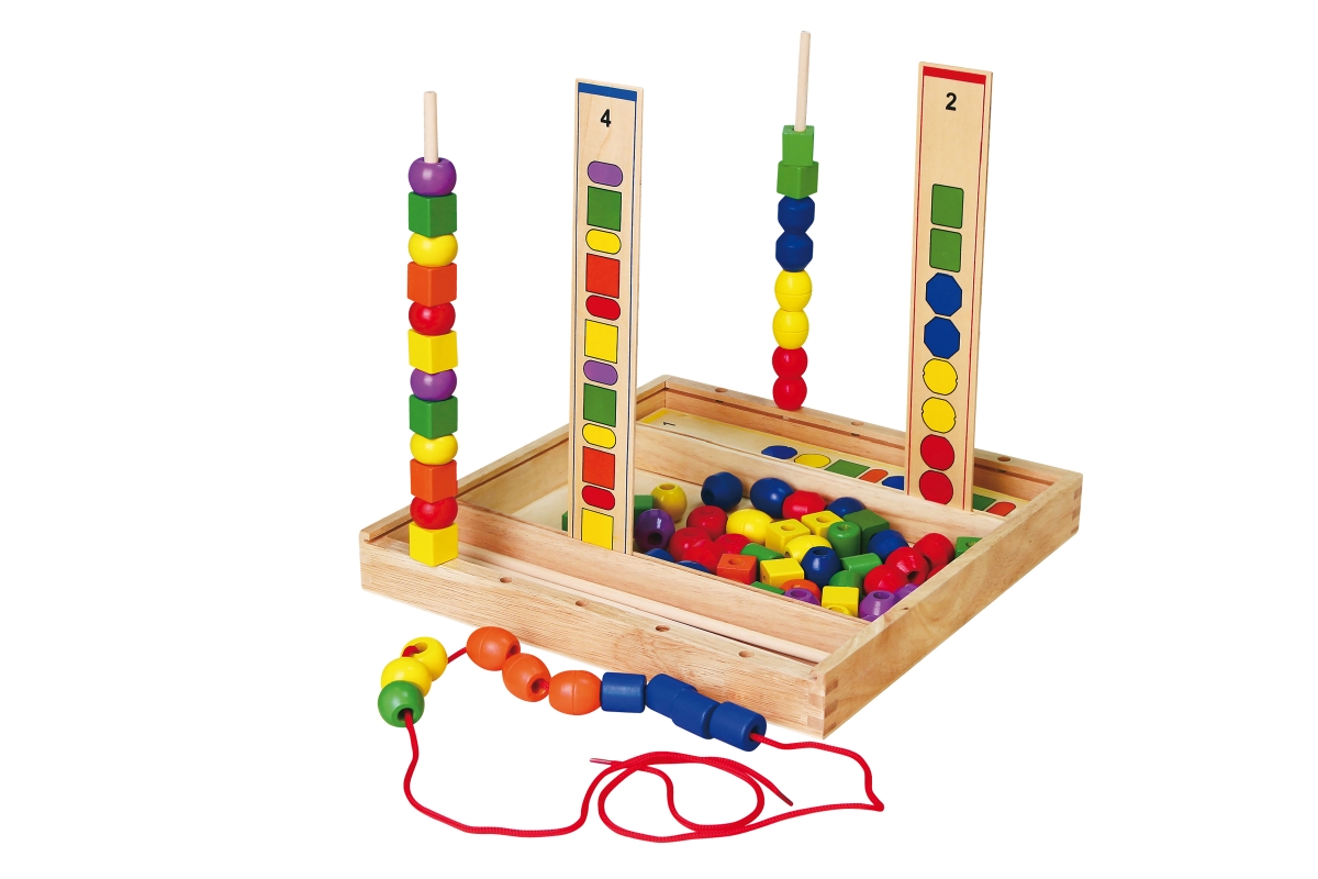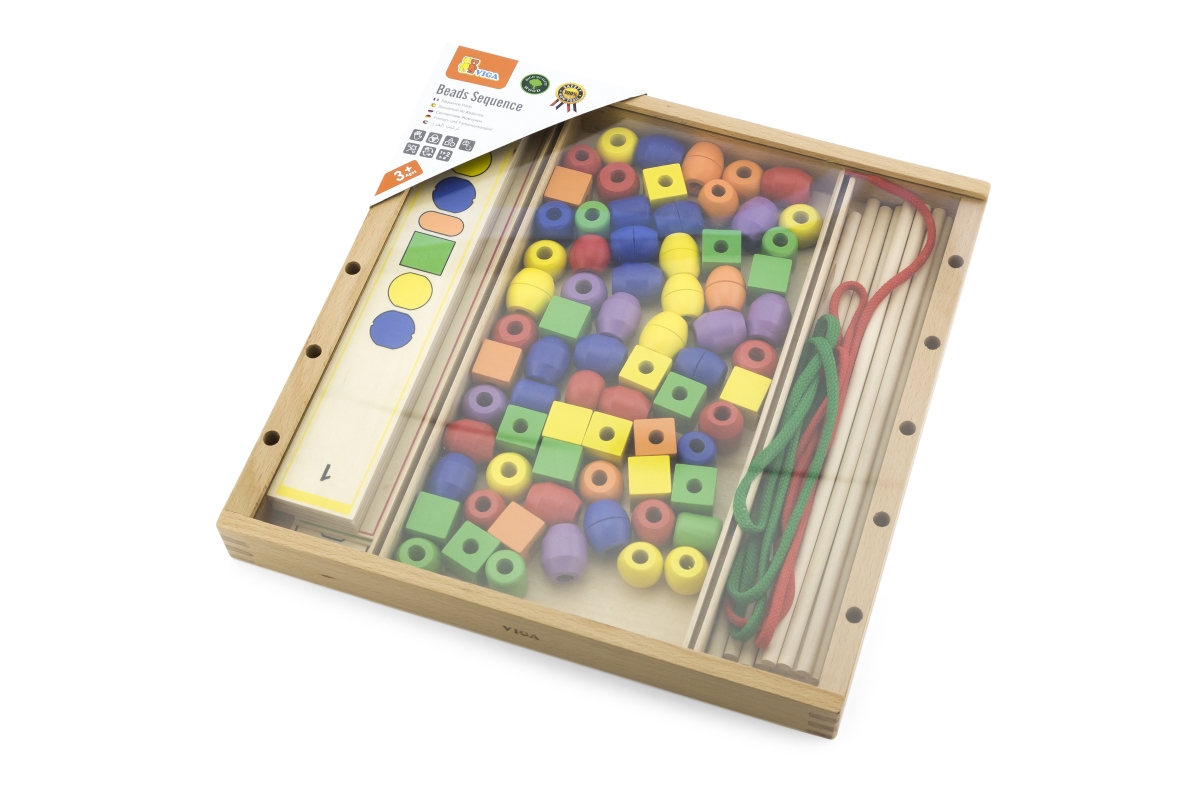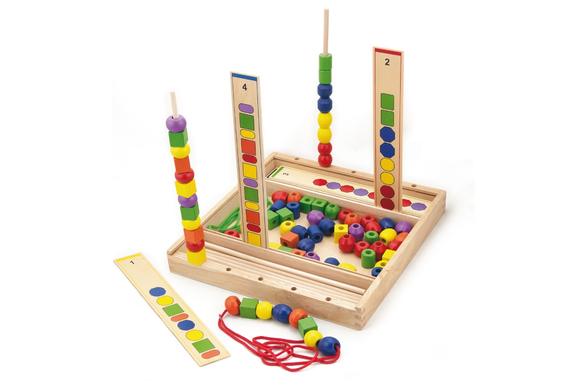 Navlékání tvarovaných korálků na dřevěné tyčky nebo provázek bude pro děti skvělým procvičením trpělivosti. V dřevěné krabičce se nachází otvory pro nasazení tyčinek a destiček s předlohou, aby se dětem pohodlně navlékalo. Protože jsou otvory po obou stranách, bude snadné ze zábavné hry udělat soutěž. Děti tak mohou s vámi, sourozenci nebo kamarády poměřit svoje síly a zjistit, kdo bude rychlejší.