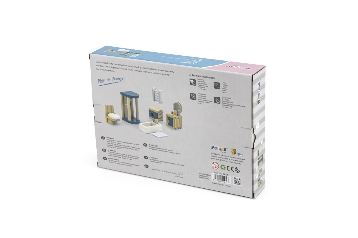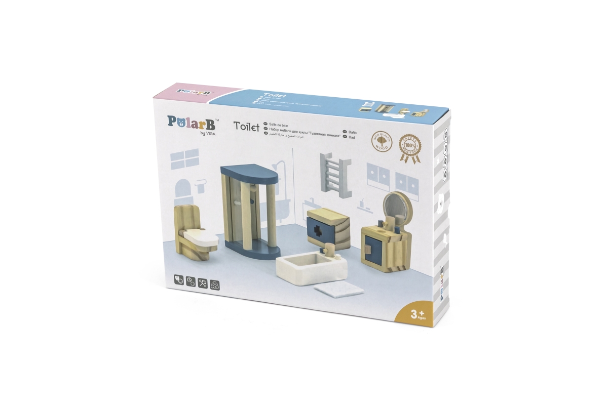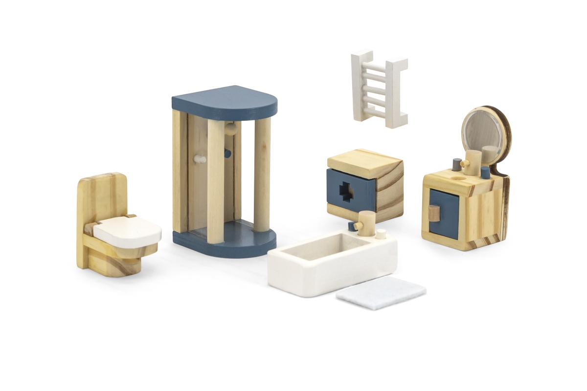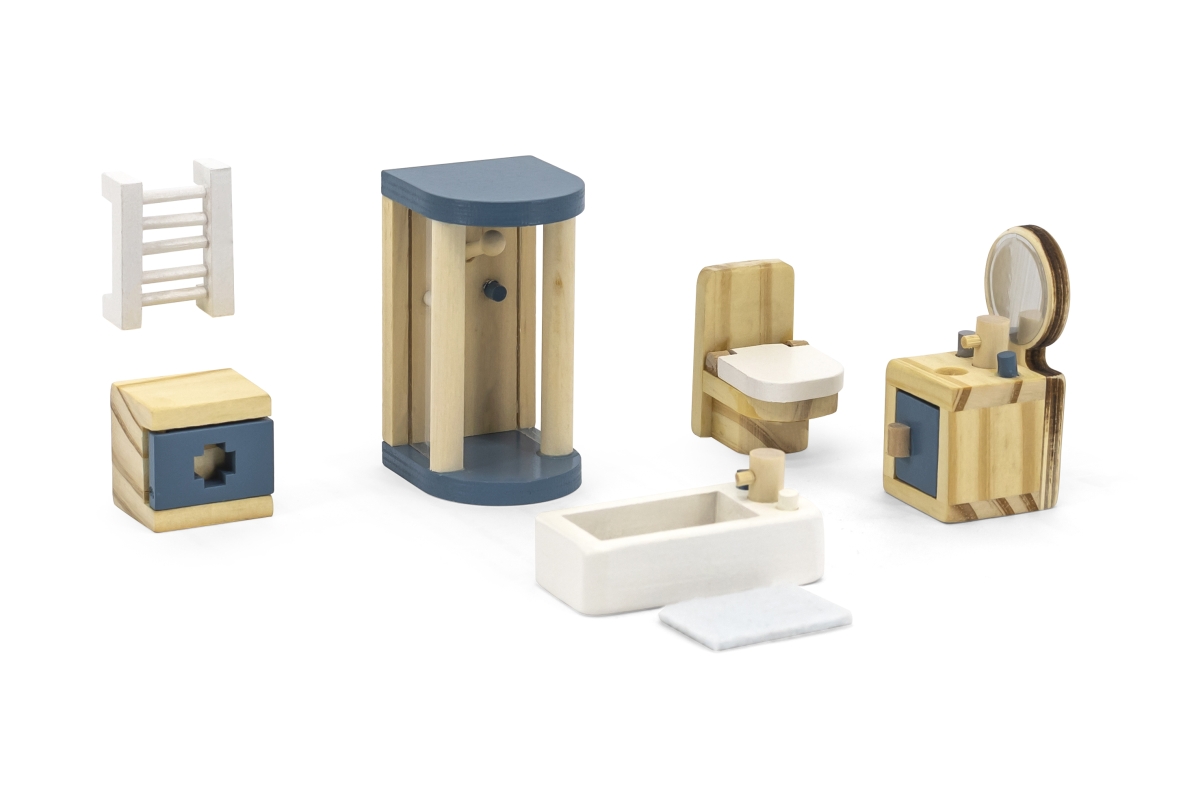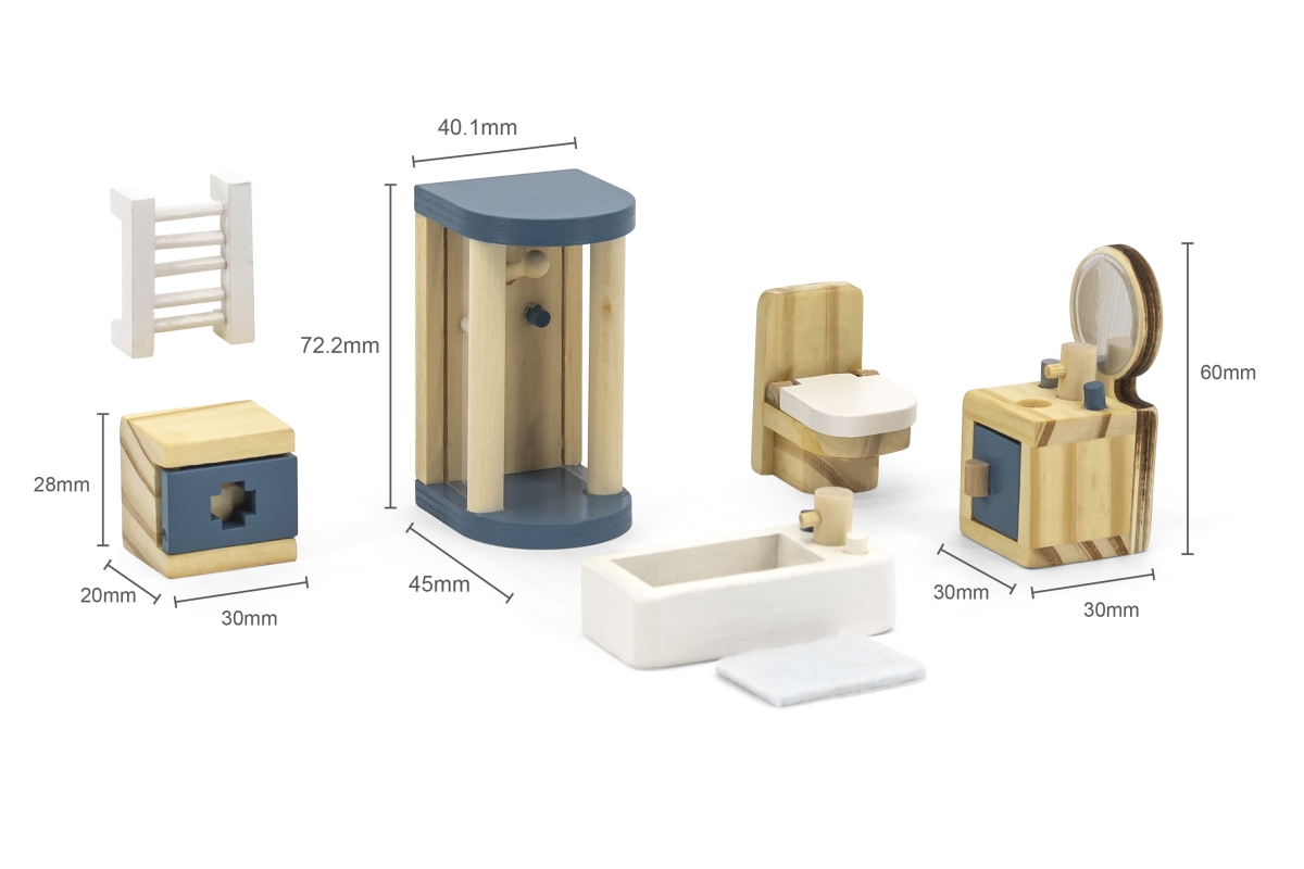Sada moderního dřevěného nábytku do koupelny potěší každou panenku. Konečně i ona si bude moci dopřát sprchu v prostorném sprchovém koutě, relaxační koupel ve vaně a vyčistit si zuby u umyvadla se zrcadlem. Koupelna pro panenky je zkrátka jako skutečná a najdete v ní vše, co v koupelně, v domečku pro panenky, nesmí chybět.