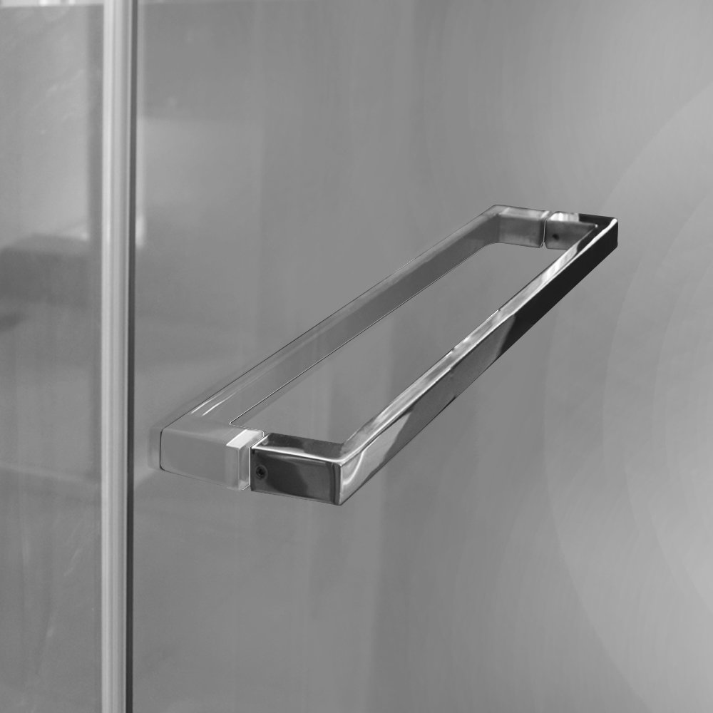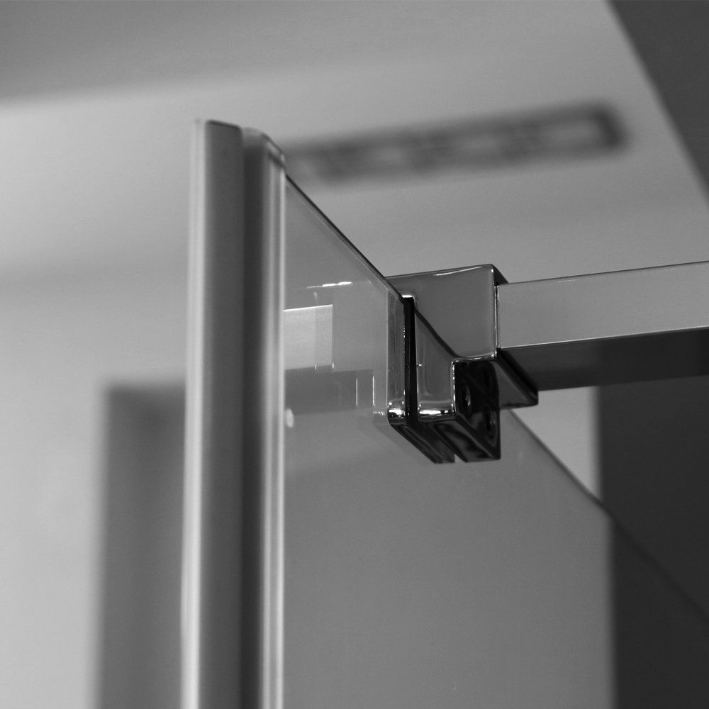 Sprchový kout obdélníkový s jedněmi otevíracími dveřmi. Jedinečná a originální série trendových sprchových koutů s hranatými detaily chromových profilů, konzol, pantů a madel.