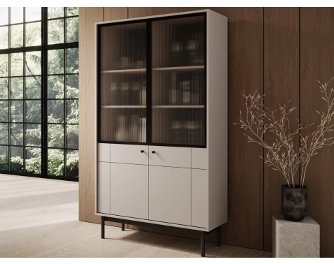 Vysoká vitrína z kolekce Japandi – přímočaré linie doplňuje decentní geometrický vzor na předních plochách, který podtrhuje moderní charakter tohoto nábytku.