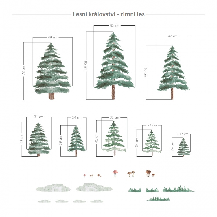 Nálepka obsahuje: 8 různě velkých stromů, trsy trav, kupičky sněhu a mix hub.