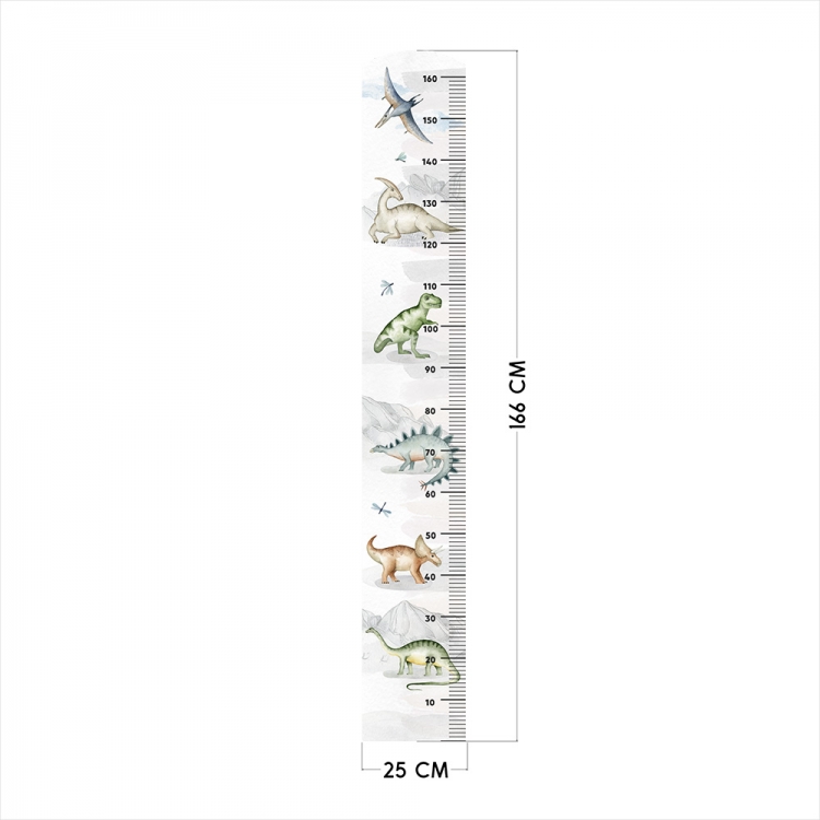 Tento samolepicí nástěnný metr je designovým prvkem pro kreativní a interaktivní výzdobu pokojíčku. Zatímco vy budete s údivem moci sledovat, jak čas utíká a vaše dítka rostou a radovat se, že jsou zas o celého dinosaura větší, děti se mohou vydat po časové ose zpět až do druhohor a seznámit se s tehdejšími obyvateli naší planety. Na větší ploše můžete využít i velké nálepky s dinosaury a získat tak ještě krásnější a kouzelnější prostor.