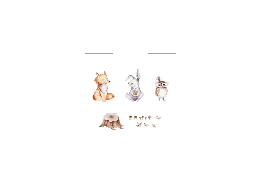 Set nálepek na zeď obsahuje osm jehličnatých stromů různých velikostí, tři velká lesní zvířátka, pařez, mix menších ptáků, hromádky sněhu, trsy trav a houby.