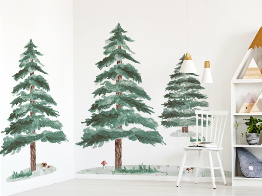 Set nálepek na zeď obsahuje tři jehličnaté stromy různých velikostí, čtyři velká lesní zvířátka, mix menších ptáků, sníh, trsy trav a houby.