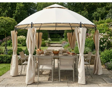 Kulatý zahradní altán o průměru 350 cm s okrasným kovovým výpletem a praktickými bočními závěsy z béžové látky, které vás ochrání před slunečními paprsky.