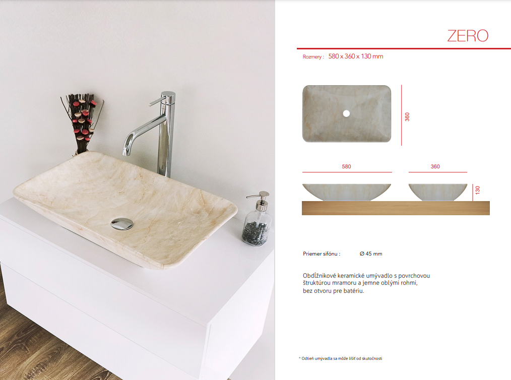 ZERO M keramické umyvadlo s povrchovou strukturou mramoru 58x36x13 cm Rozměry: 580 x 360 x 130 mm Otvor pro sifon Ø45 mm Bez přepadu Keramické oválné umyvadlo s povrchovou strukturou mramoru Odchylka od uvedeného rozměru…